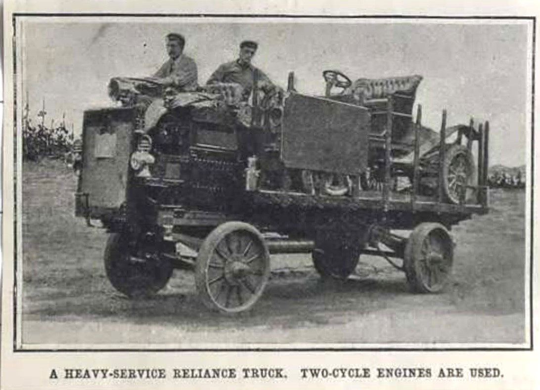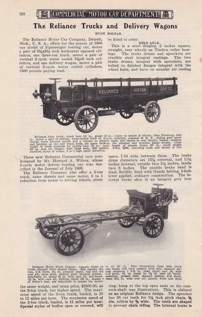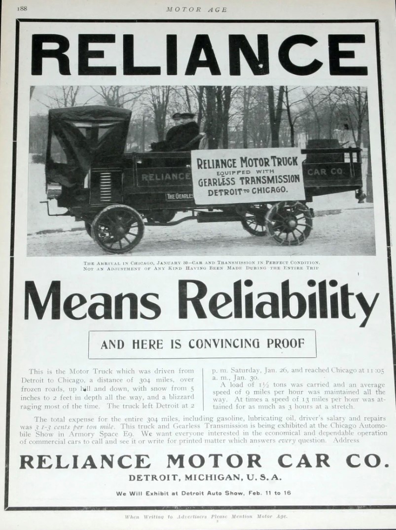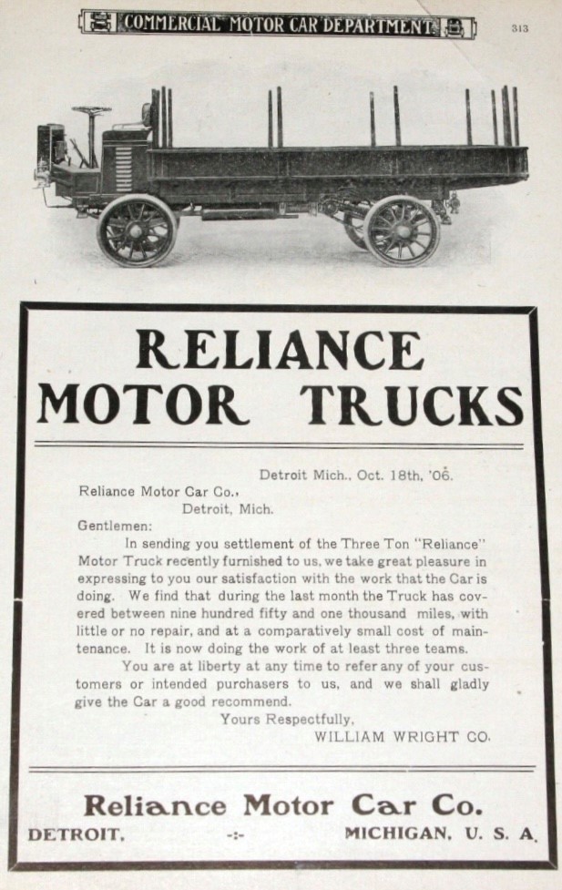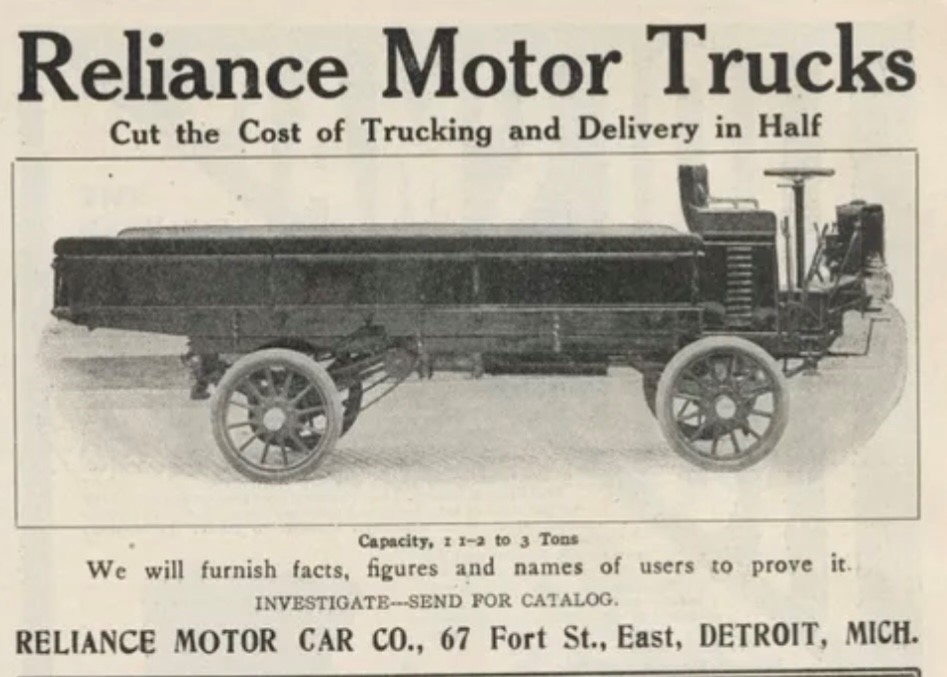 In 1911, Reliance Motor Truck was the first truck equipped with Pneumatic Tires. These were developed and built by the United States Nobby Fabric Pneumatic Truck Tires. Wright and Morgan was the Detroit distributor.