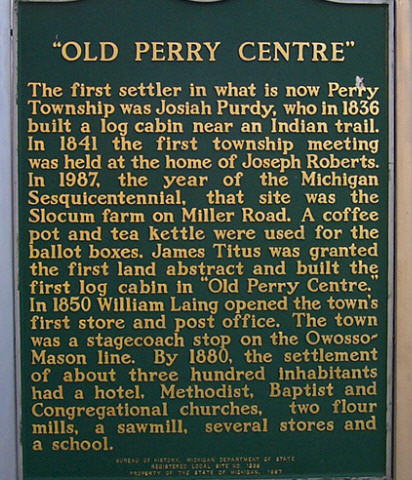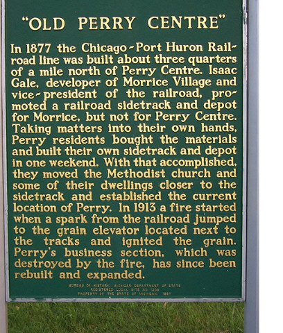 In the beginning, Perry Center, developed on land owned by Horace Green and Dr. Joseph P. Roberts. William Laing, who founded the village, opening it's first store here in 1850 and becoming its first postmaster on Jan. 17, 1850. When the Grand Trunk Railroad came through in 1876, it was about a half mile south of the town, so the village was moved to it's present location, closer to the railroad tracks. The Post Office was always named simply Perry, even before the move. The village was incorporated in 1893 and named after the American navel hero, Oliver Hazard Perry.