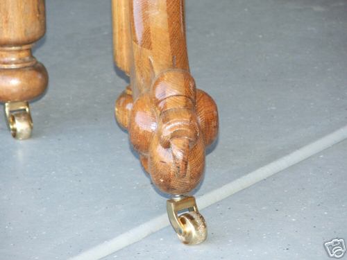 Table below extends to nine foot ten inches with all six leaves inserted. All six leaves store inside the table behind a door on the apron. The table legs, claw feet and the apron are made of oak and the top is a great victorian ash grain. Measurements are 29 1/2" tall and 44" by 49" before inserting the leaves.