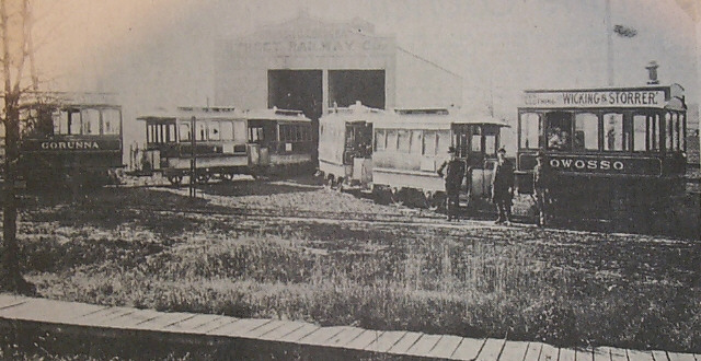 Appears to be powered by steam, before the turn of the century. Notice the two engines, you can see the stacks on both the OWOSSO and the CORUNNA. And the engines look like regular passenger cars, which was to keep from scaring the horses. Remember, this track went down the middle of the street and shared the road with the horse and buggy.