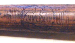 The Bat measures approximately 32 ?" in length with a diameter (at the widest) of approximately 2 1/8". It has an ornate impressed mark that shows two crossed baseball bats with a laurel leaf circle over them. In the center of the circle it has "James N. Zimmerman" and on one side of the circle it has "OWOSSO" and on the other side "MICH." Below that it has "No. 120"