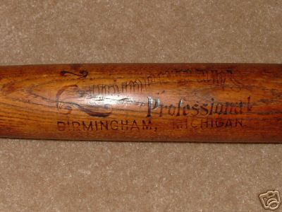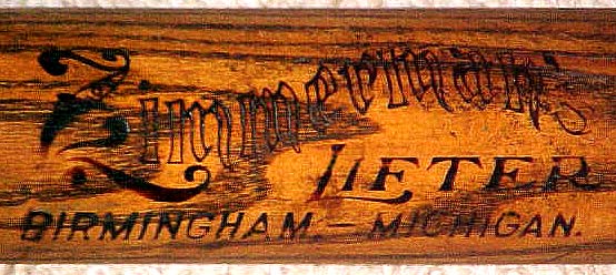 Below is a rare Zimmerman LIFTER baseball bat manufactured by Zimmerman's Mill which was located on West Maple at Baldwin St., just east of the Quarton Lake waterfall in Birmingham, Michigan. The bat was made circa 1900. In addition to his own brand of bats, Mr. Zimmerman also manufactured famous "Louisville Sluggers", shovel and ax handles, and even pointers for use by Hill School teachers wishing to call attention to specific areas of maps and wall charts.