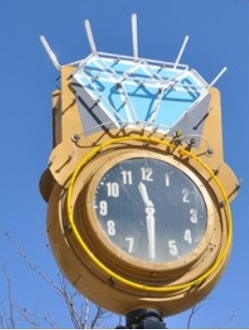This unusual neon Brown Street Clock stands in front of S.E. Nedhams Jewelers.