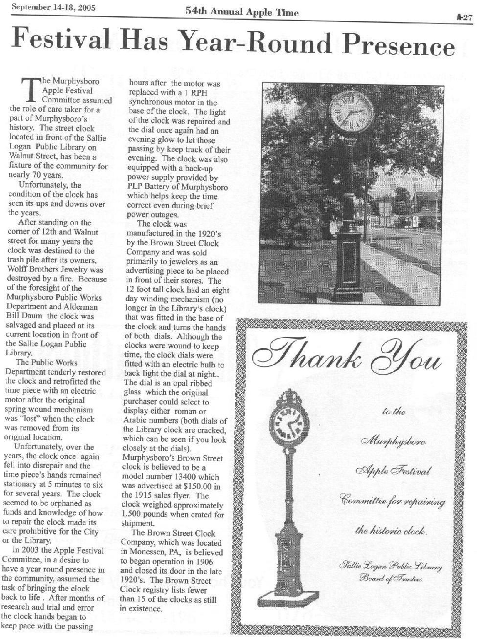 in the base. The clock is maintained by the Murphysboro Apple Festival Committee.