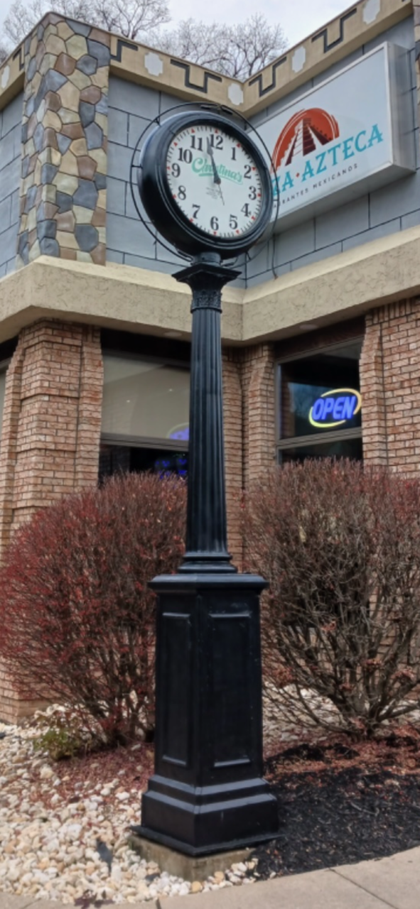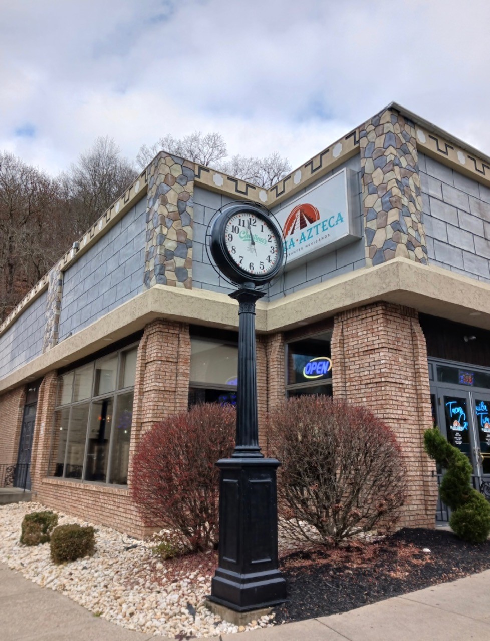 This Brown street clock is located in front of the Plaza Azteca restaurant at 3017 Jacks Run Rd. in White Oak, PA.