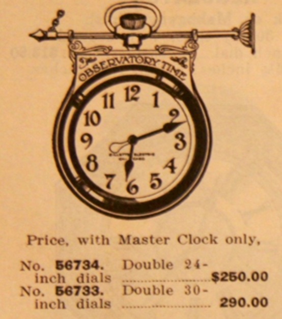 The word "observatory" is imprinted at the top of Gillette street clocks and most likely refers to various master clocks including one from the Self Winding Clock Company. In that case, the master clock would have received Western Union time signals insuring great accuracy.