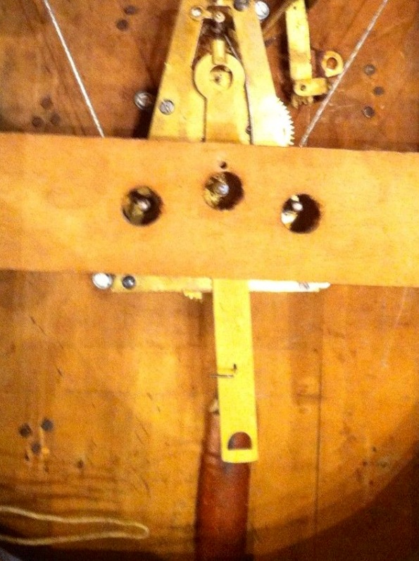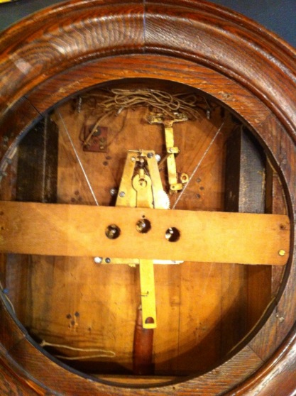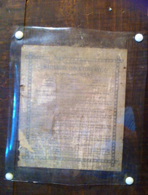 This Gillette master clock was manufactured by the Waterbury Clock Company and is a weight driven pendulum movement. The movement operated a lever which made an electrical connection once per minute, via batteries, which send an impulse to the Gillette Street clock which was located in front of the jewelry store on the sidewalk. The sidewalk clock was actually a slave clock in that it's movement was powered by the master clock located inside the store building.